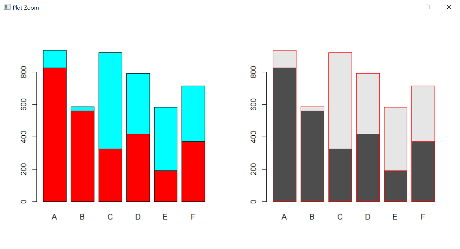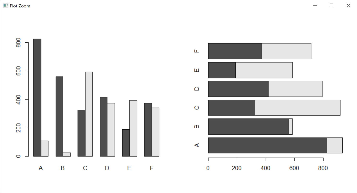 beside 인수는 기본값이 FALSE이다. FALSE이면 높이의 열이 누적 막대로 표시되고, TRUE이면 열이 나란히 놓인 막대로 출력된다.