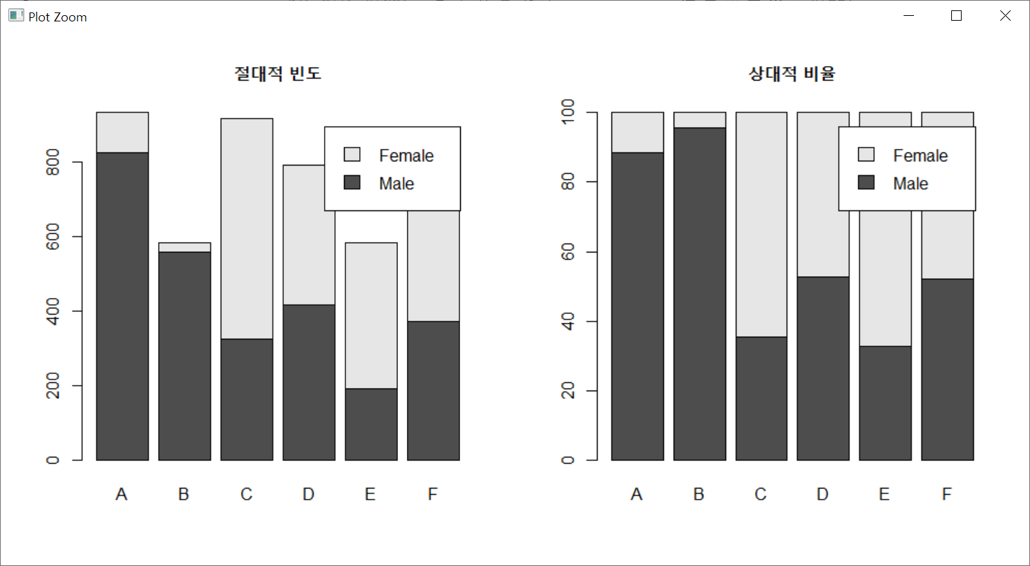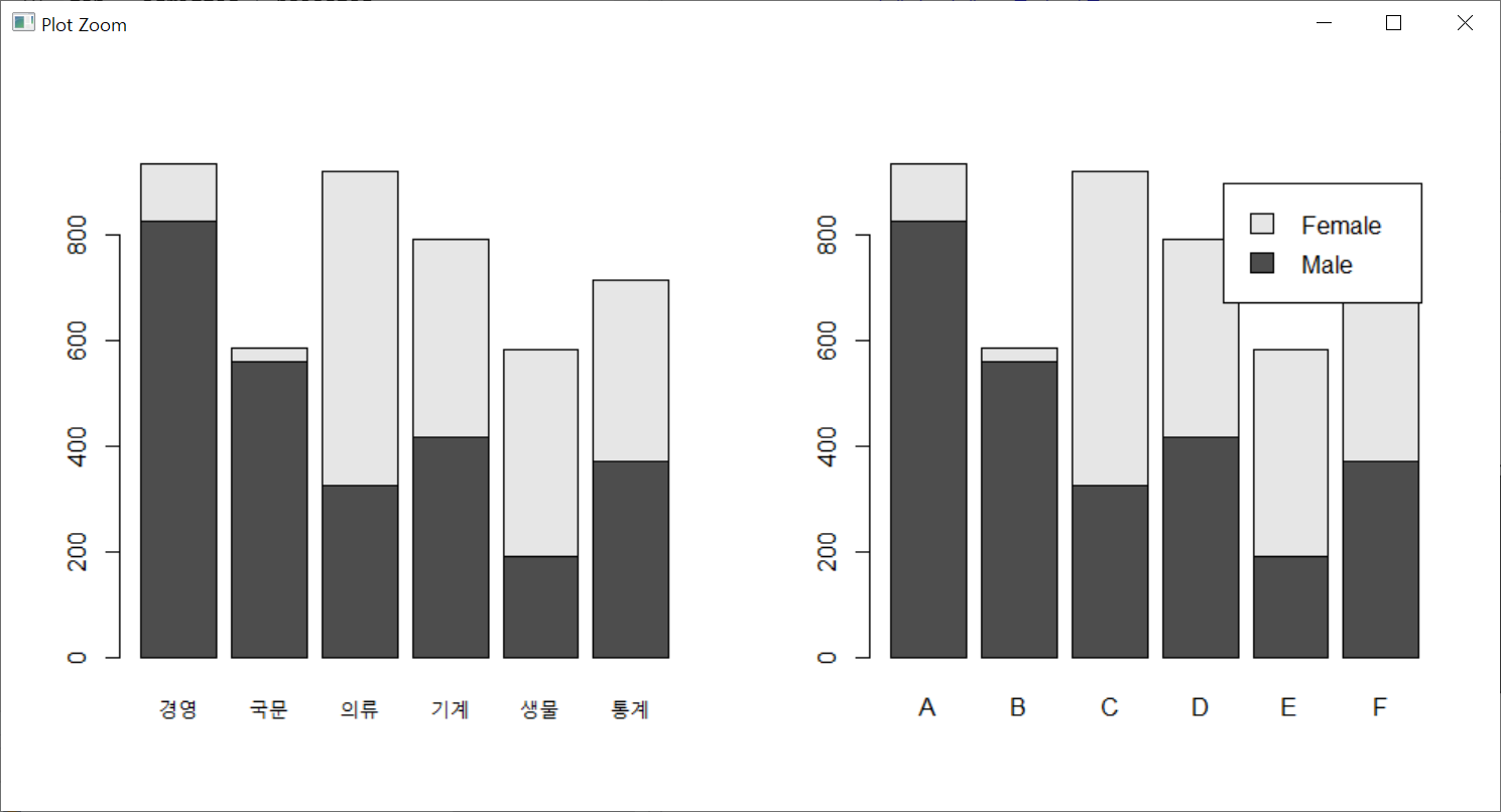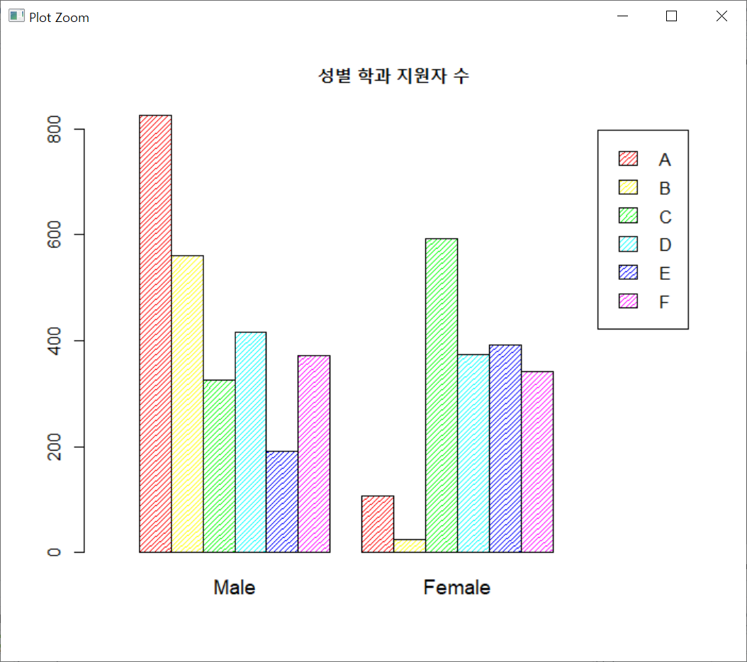 이번엔 데이터를 전치시켜서 성별로 지원학과의 분포를 막대그래프로 출력해 보았다. 이제까지 legend 인수에 rownames() 함수를 사용했지만 이번 데이터는 전치를 시켰음으로 colnames() 함수를 사용하였다.