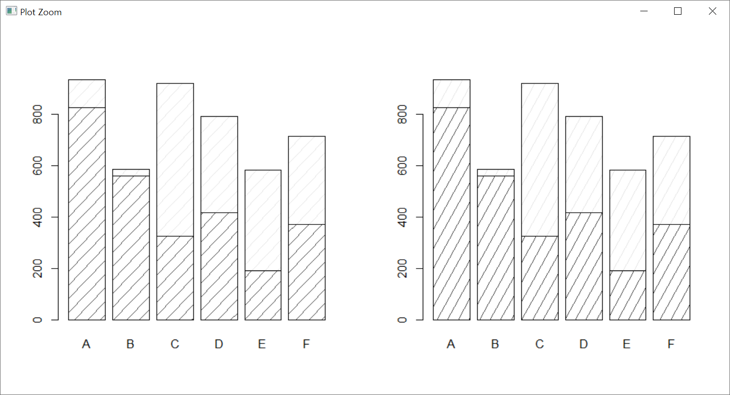 density 인수는 막대 또는 막대의 구성요소에 대한 음영 선(빗금)의 밀도를 인치당 선의 수로 지정한다. 기본값 NULL은 음영 선이 그려지지 않음을 의미한다.