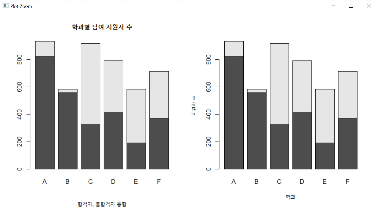 오른쪽 막대그래프는 학과 간의 남녀 비율을 상대적으로 비교해 본 것이다. y축을 보면 0부터 100까지의 값을 가지는 것을 알 수 있다. 상대적 비율이기 때문에 지원자 중 남자 비율이 어느 학과가 더 큰가를 비교하기에 좋다.