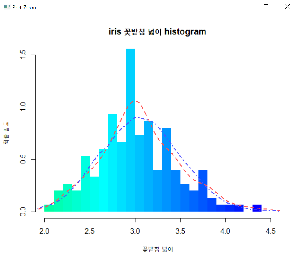 + freq=F, main="iris 꽃받침 넓이 histogram", nclass=24,