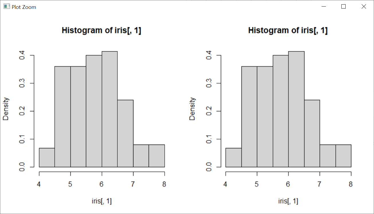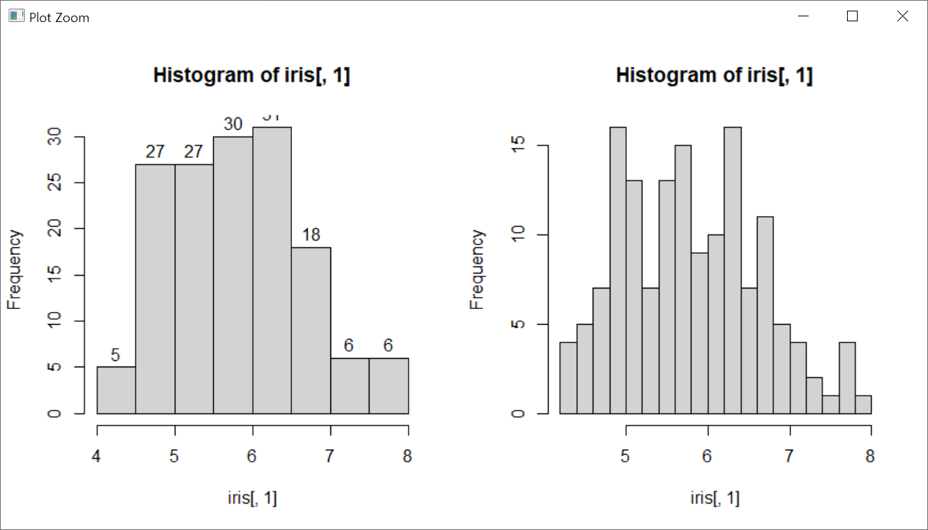 | plot | TRUE이면 히스토그램 출력 FALSE이면 자료값들을 리스트로 반환 |
