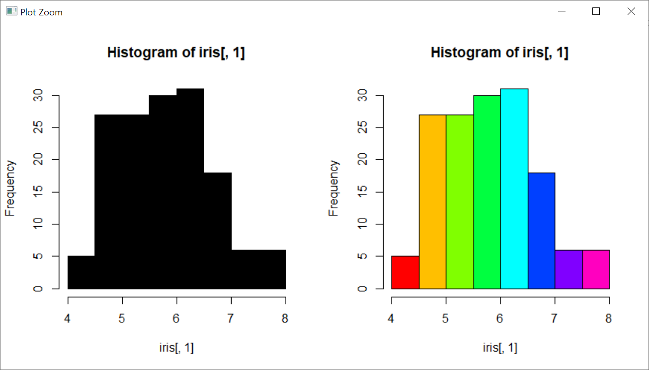 > hist(iris[,1], col="#000000") # col="black" 과 같은 결과