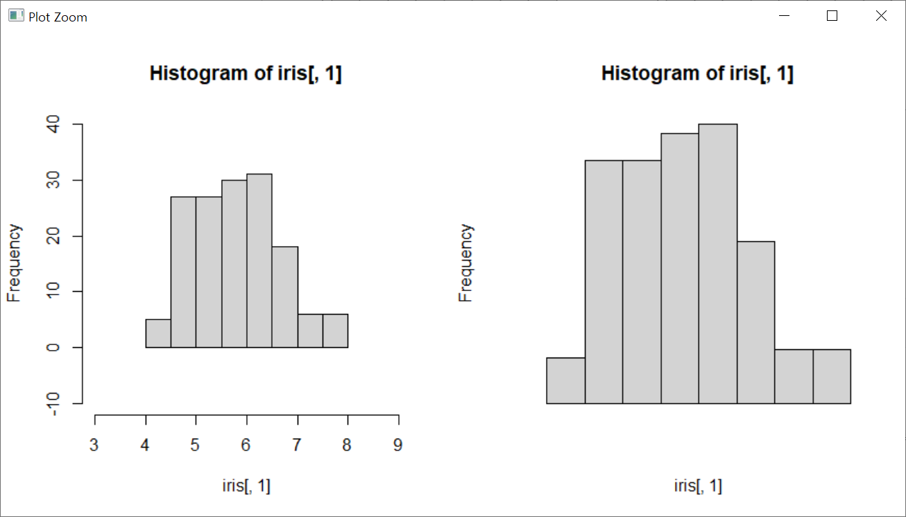 > hist(iris[,1], xlim=c(3,9), ylim=c(-10,40))