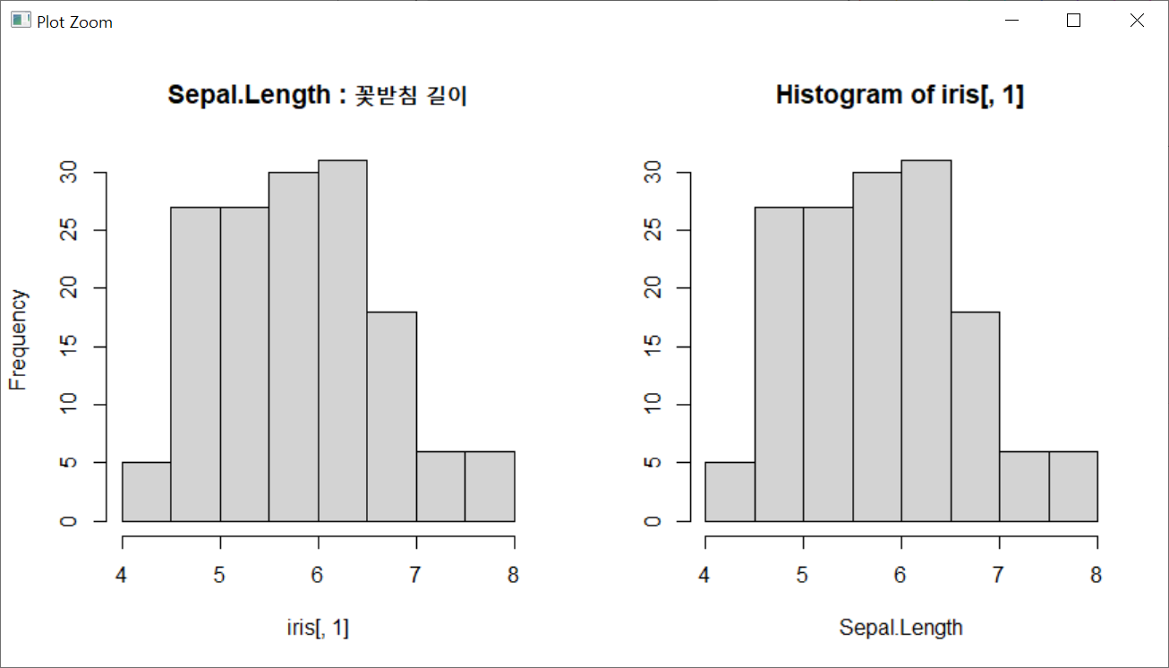 > hist(iris[,1], main="Sepal.Length : 꽃받침 길이")