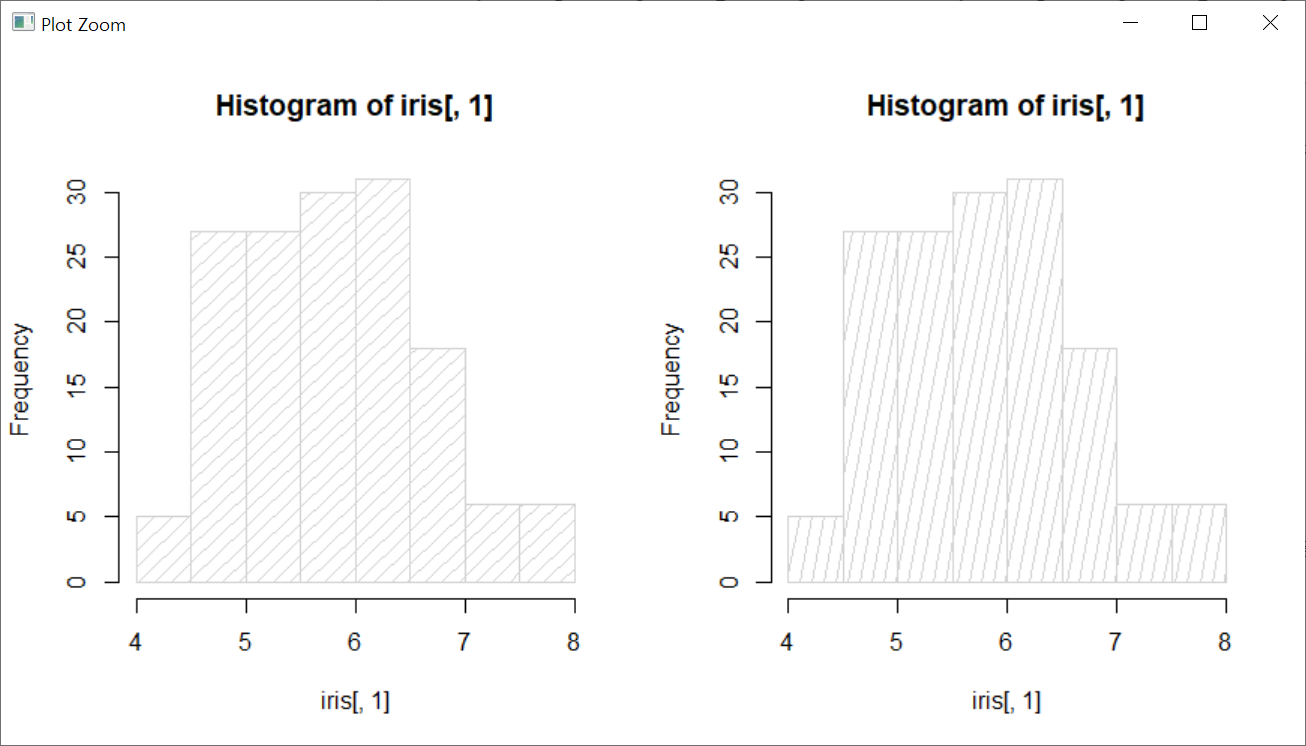 density 인수는 막대 또는 막대의 구성요소에 대한 음영 선(빗금)의 밀도를 인치당 선의 수로 지정한다. 기본값 NULL은 음영 선이 그려지지 않음을 의미한다.