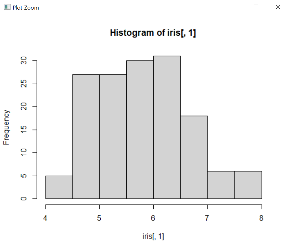 iris 데이터셋의 첫번째 변수인 꽃받침의 길이를 히스토그램으로 그린 그래프이다.